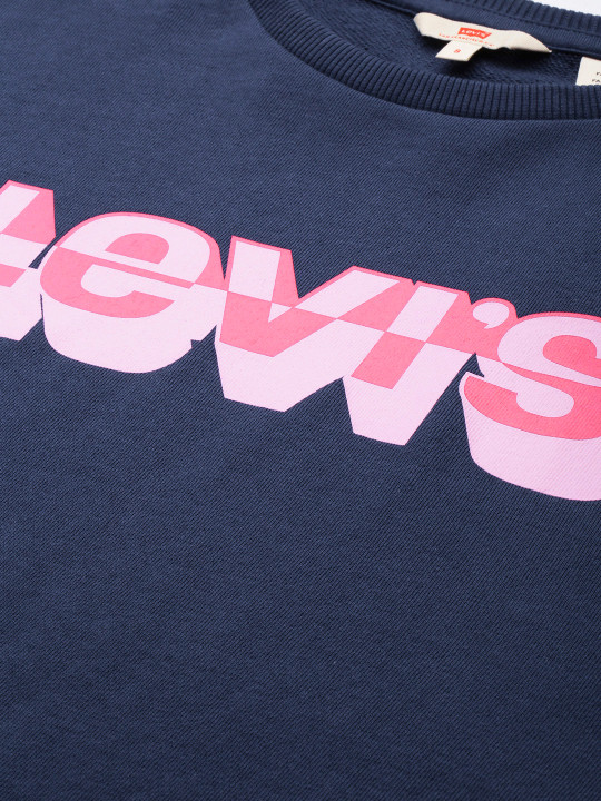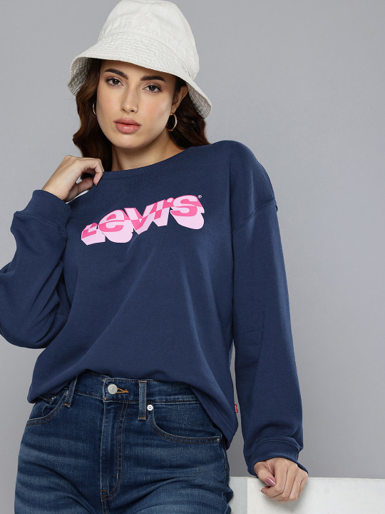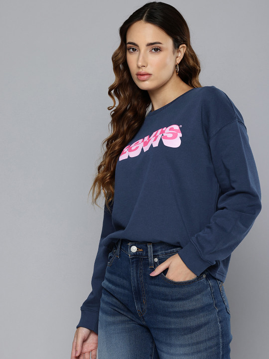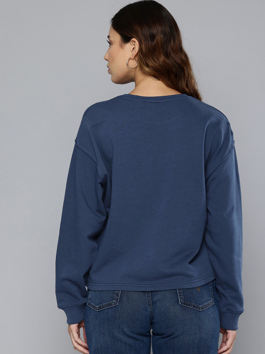 Navy blue printed sweatshirt has a round neck, long sleeves, closure, straight hem