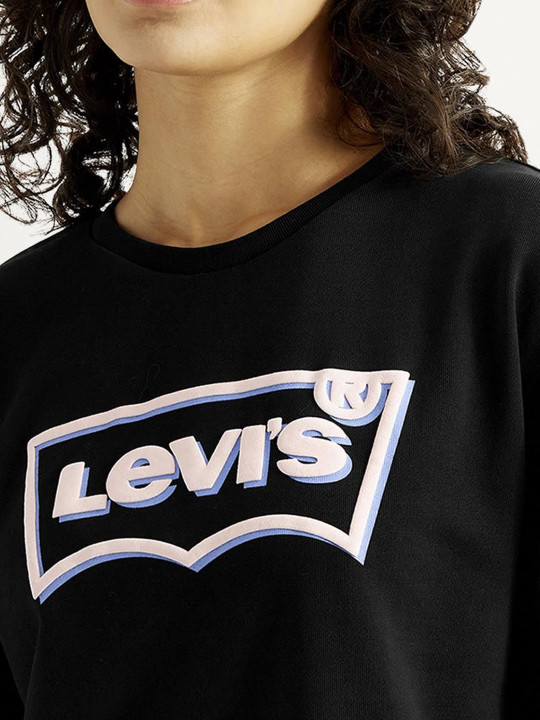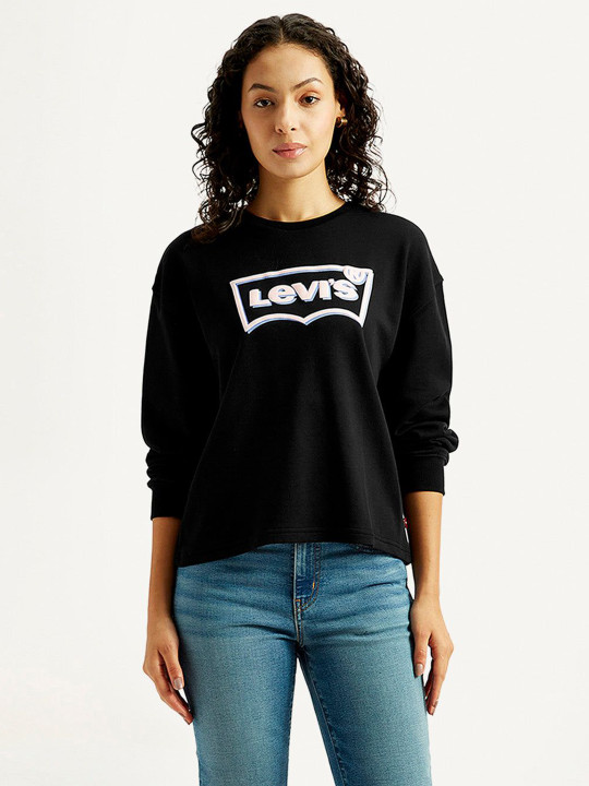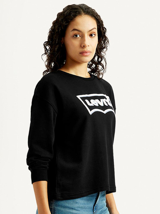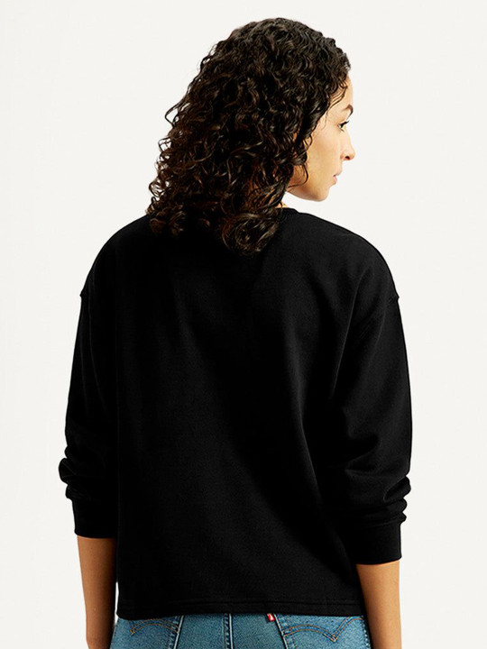 Black printed sweatshirt has a round neck, na pockets, long sleeves, closure, straight hem
